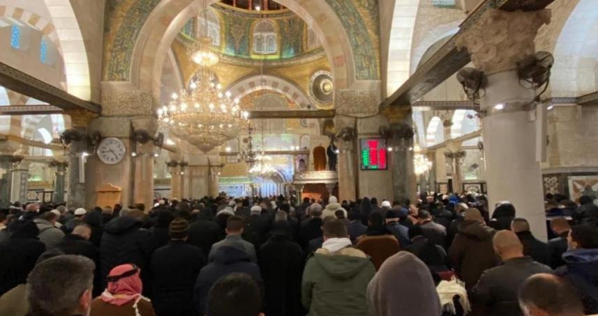 واحتشد آلاف المصلين في المسجد الأقصى المبارك، وامتلأت المصليات المسقوفة بالمصلين بينهم عائلات ضمت نساء وأطفال رغم الأجواء الماطرة والبرد الشديد.