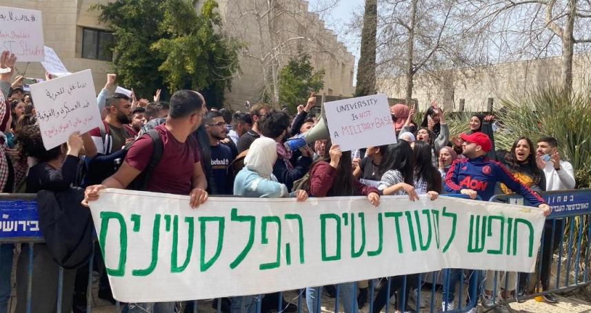 وشارك الطلاب في وقفة بحرم جبل المشارف التابع للجامعة العبرية في القدس المحتلة، علمًا بأن عناصر من شرطة الاحتلال والذين يدرسون في الجامعة العبرية، أوقفوا أمس عدًدا من الطلاب وأبعدوهم عن الحرم الجامعي لستة ايام.