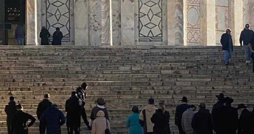 واقتحمت مجموعات من المستوطنين باحات الأقصى من جهة باب المغاربة، وأدوا طقوسًا تلمودية فيه.