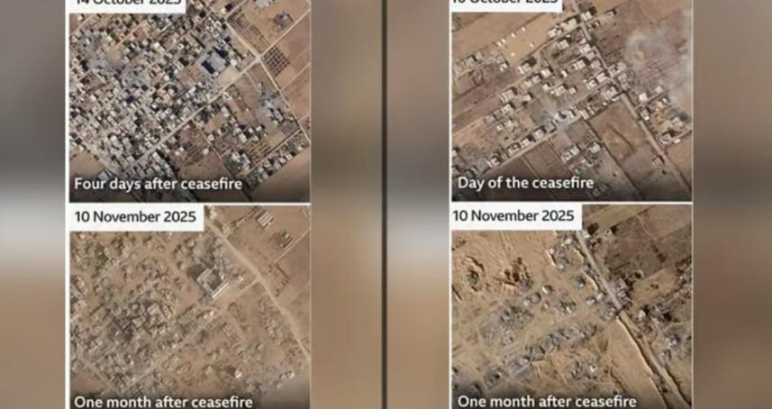 وكشفت الصور أن الأحياء الخاضعة لسيطرة جيش الاحتلال الإسرائيلي سويت بالأرض خلال شهر واحد من وقف إطلاق النار، وأن الدمار يتركز بشكل خاص في بلدة عبسان الكبيرة شرق خان يونس ومنطقة البيوك بالقرب من رفح.