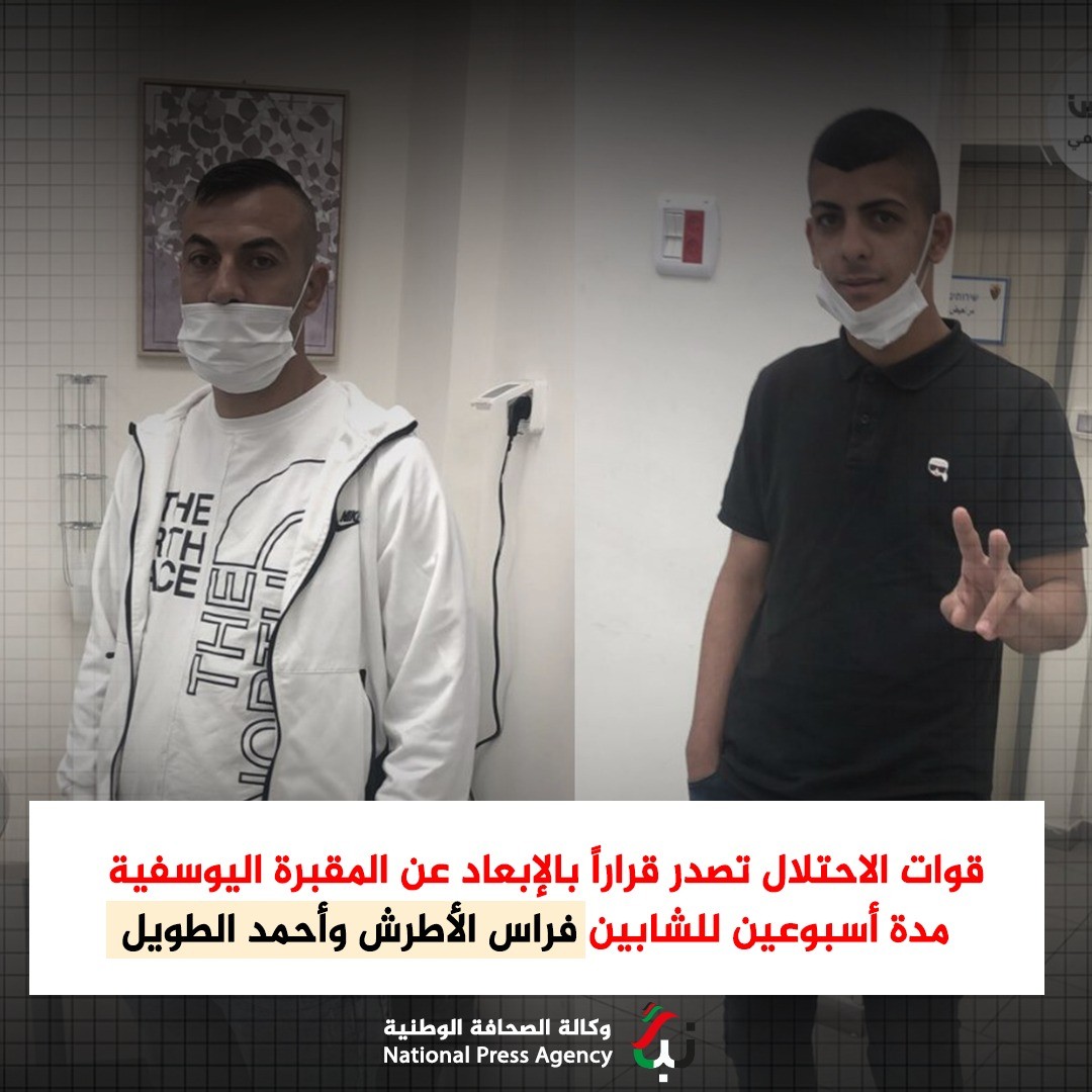 وقالت مصادر محلية في القدس: إن قوات الاحتلال أصدرت قراراً بالإبعاد عن المقبرة اليوسفية مدة أسبوعين للشابين فراس الأطرش وأحمد الطويل، بعد تصديهما لقوات الاحتلال التي تقوم بأعمال تجريف وحفريات في المقبرة.